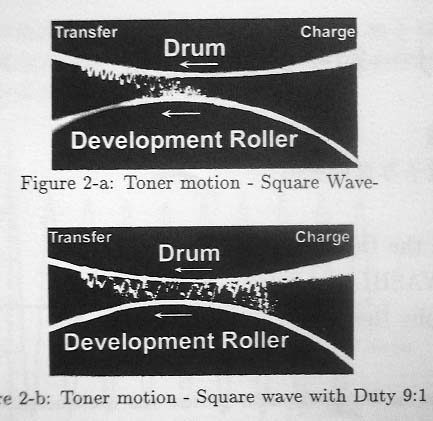 この写真中では画面上のドラムと現像装置は500um離れている。また、上と下の写真ではトナーを飛行させるための電界の波形が異なる。上が単純な矩形波であり、下が矩形波の正と負の電界がかかる時間長さが異なるものである。まるでトナー粒子の動きが物理的なオシロスコープのようである。