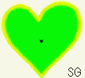私が見た「赤」信号機の錯覚を実感してもらうために、こんなアニメーションGIFを作ってみた。ソフトをレジストしてないが故の、SGという文字は気にしないでもらいたい。下の画像中央にある黒い点を見つめていて欲しい。すると、緑のハートマークが消えた瞬間から、赤いハートマークがおぼろげに見えるはずである。