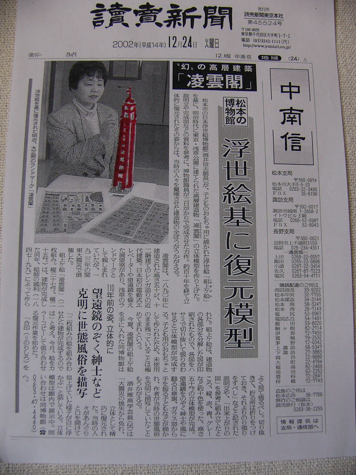 「ペーパークラフト」で書き加えられていた「建築ペーパークラフト」も確かに面白いなぁ、と思っていた。そしたら、今日偶然日本浮世絵博物館で昔々に作られた「凌雲閣」の紙模型を見た。ちなみに別の新聞記事ではこんな感じになっている。こんなペーパークラフト、「紙」で作るいろんなもの・昔のもの・世界のもの、ちょっとそんな風に眺め直してみようかな。