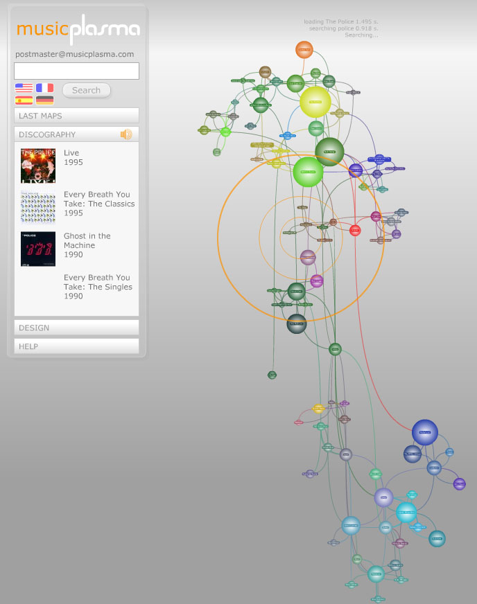 音楽アーチストの名前を入力・検索すると、そのアーチストに関係する相関図が表示されるという超スグレもののmusicplasma。検索結果ではディスコグラフィーも表示される。ちなみに、右の画像は"The Police"の検索結果。もちろん、そのアルバムを視聴もできる。検索結果の相関図の迷路の中で色んなアーチストの音楽を聴いたり、懐かしい出来事を思い出したりもとても楽しい。とにかく、超スグレもの。 from B面