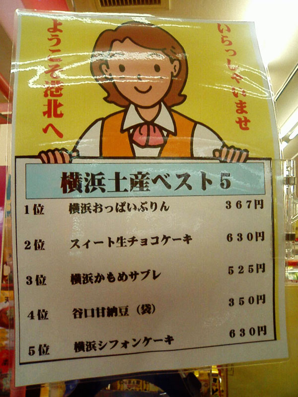 東名高速の港北SAで見かけた「横浜土産ベスト5」 その栄光の第一位は…!?。なんと、横浜おっぱいぷりん367円ナリ。本来在庫整理品だったハズのプリンが、「おっぱいぷりん」に変えただけで…。おっぱいパワー恐るべし。