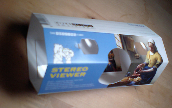 こういった名画が一体どんな立体画像として見えるのだろう?と興味を持つ人も多いでしょうから、この「名画を立体視ができるようにしたグッズ」を覗いた時に見える景色、たとえばフェルメールの"Milk"を覗いた時に見える小さいけれど立体的な世界を、右にアニメーションGIFとして貼り付けてみました。といっても、カメラ付きケータイで「名画を立体視ができるようにしたグッズ」に空いている穴を覗きつつシャッターを押して、左右の画像を撮影しただけです。そのため、ずいぶん画質は悪くなっていますが、それでも、少しは立体的なようすがわかることを願っています。