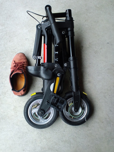 畳んだ時の大きさはとても小さく、車重も軽いため「持ち歩き」は非常に気軽にできるように思えます。右上の写真は、折りたたんだ時の形状です。サイズ比較用の「25cmの靴」と比較してみれば、実に小さいことがわかります。テニスラケットを2本入れたようなバックと同じか、それより少し小さいくらいの感じです。バックは少し大きめに作られているので、厚手の買い物バッグに入れて持ち歩いてもまったく問題ないくらいの大きさと重さです。