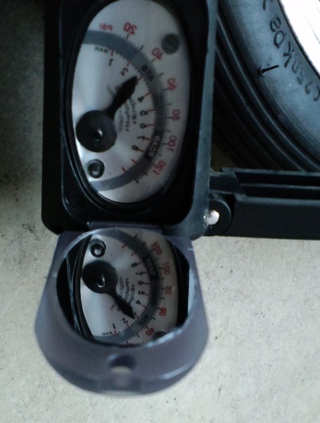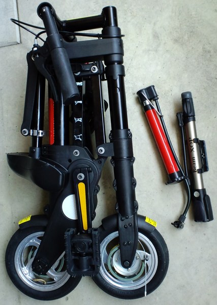 付属のマニュアルには、8インチのタイヤに入れる空気の圧力は2.5気圧にすべし、と書いてあります。実際、空気圧を計ってみると、その空気圧に調整されていました。ただ乗ってみた感覚では、少しタイヤが柔らかく感じたので、空気圧を少し高めの3気圧にしてみました。(右の写真に写っている)付属の赤い空気入れでも特に問題なく空気を入れることはできましたが、今回は圧力を見ながら空気を注入するために(右の写真では付属の赤い空気入れの隣に写っている)別の空気入れを使いました。