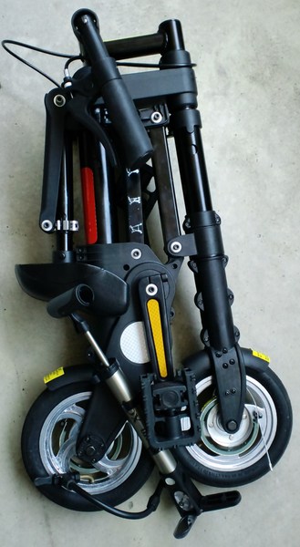 」といった具合に、たくさん出ています。私の買ったのは「タイヤが本家より大きめの8インチだけれども、本家と同じ空気タイヤ(チューブタイヤ)を使っているバージョン」です。右上の写真でわかるように、折りたたむんでバッグに入れた時のサイズを新書と比べてみても、本当にびっくりするくらい小さいことがわかると思います。「