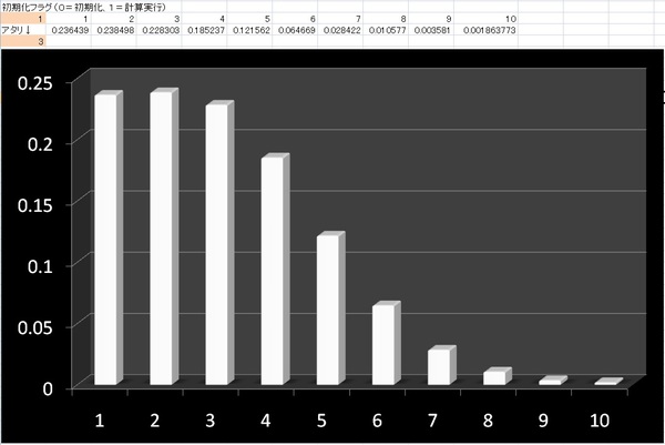 というわけで、エクセルでプロトタイピングして、作ってみたのが下の計算シートです(作成したエクセルシートはここに置いておきます)。たとえば、下のグラフは、アタリが左から3番目縦下部にあった場合に、一体、どの縦線を選ぶの良いかを示す確率分布になっています。今のこの状態なら、左から1番目、2番目、3番目が大体同じアタリ確率になっていて、もう少し細かく眺めてみると、左から2番目を選ぶのが一番アタリをひく可能性が高い、ということがわかります。