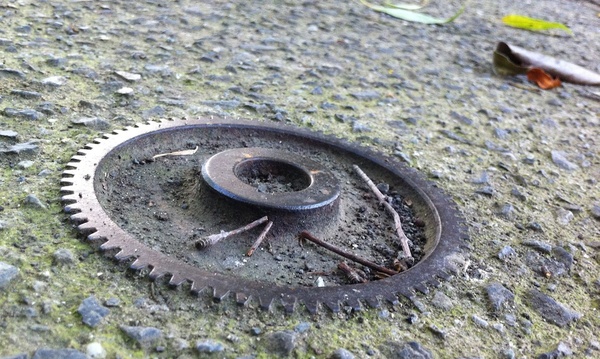今日眺めた「理系の散歩道」は新横浜駅近くにある「新田緑道」です。暑い日差しを心地良く緑(みどり)が遮(さえぎ)る小道には、懐かしくも力強い機械や部品が詰まっていました。足下にギアやチェーン形状が埋め込まれているかと思えば(右写真に見える”ギア”は道路に埋め込まれた”ギア”なのです)、ふと座り込んだベンチもチェーンの形をしていたりします。そして、道の端を彩るのはプーリーやネジで、ところどころにボール盤やバープレスなどが置かれていたのです。