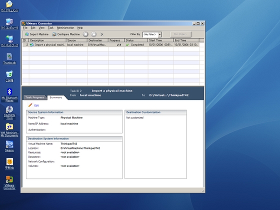 まず、古いPC上でVMware converterを動かすと(右上の画像が動作画面例)、2時間ほどで、100GB弱のシステムドライブから完全に仮想環境が生成された。そして、その仮想環境を新しいPC上のVMwareで読み込むと、何の問題もなくこれまでの古い環境がVMwareで動き出した。古いPCから新しいPCへのソフト移行もデータ移行もする必要がなく、あっけないくらい簡単にPC移行作業は終わる。なぜなら、新しいPC上でこれまでのPC環境とほぼ同じ仮想システムがそのまま動いているからである。
