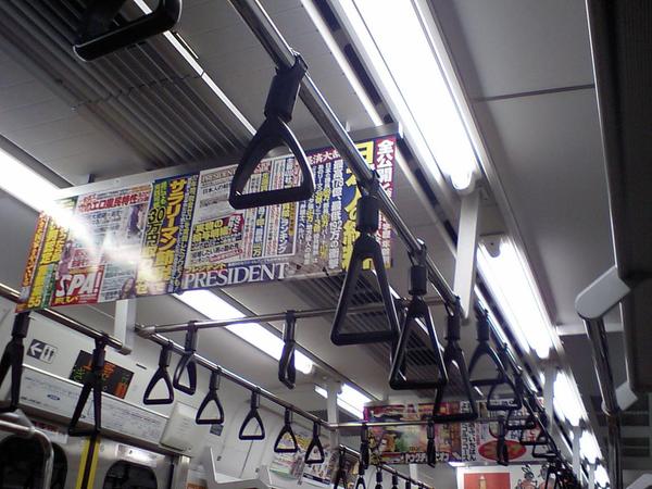 鉄道が大好きのテツちゃん、血液中には鉄分が流れまくり・・・というわけではないのですが、この列車の「吊り手」の方向変化にはとても興味を惹かれます。吊り手のベルト部分を剛体に変え、吊り手の(乗客が)掴む部分の方向を90度変えるという変更は、一見すると小さい変更のようでいて、実はとても大きな変更・効果が生じているように思えます。