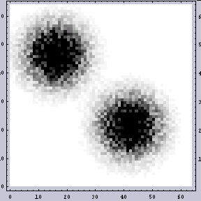 それでは、今回の本題に入る。以下が原画像である。左が「2つの大きなドットからなる」画像であり、右がそれにノイズの加わった「ノイズ」画像である。ここでノイズはホワイトノイズを加えているつもりである。ドットは周期性を持つデータだが、ノイズ自体は周期性を持たない所がミソである。また、ここで言う「ノイズ」とは現実の現象とは何ら関係がない。単なる例えである。![]() | ![]() |