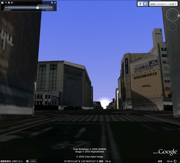 ・・・と聞けば、そんな景色を眺めてみたくなることと思います。そこで、Google Earthで京都四条河原町の交差点に行き、太陽を表示するモードにして、今年の秋分の日、午後5時40分に時空間トリップしてみました(Google Earthを特定の時間・場所・向きを指定して起動できる”リンク”があれば、そんな”リンク”を挿入したいところです)。それが、下の映像です。東西に走る四条通りの先の山上に、太陽が沈んでいくさまを見ることができます。こんな幻想的な風景は、液晶ディスプレイの中に見るだけでも、とても魅力的な景色です。