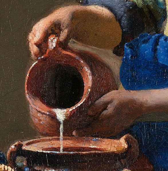 確かに「ミルクを注ぐ女」を眺めてみると、「ミルクを注ぐ女」が手に持つ水差しからはミルクが流れ出ることは不可能であることに気づかされます。水差しから滴るミルクは、太さがほぼ一定でおおよそ真っ直ぐ鉛直になっていますから、ほとんど動かない(定常)状態の水差しからミルクが落ちているように見えます。その一方で、画を描く視点は、水差しの口より高い位置にあるにも関わらず、水差しの中(入口の奥)には(地球の重力に従って、水差しの口と同じ高さで・ほぼ水平面になっていなければならないはずの)ミルクが全く描かれていないのです。…つまりは、「ミルクを注ぐ女」が手にする水差しの中には、「流れ出す」ことができるミルクは存在していない、というわけです。