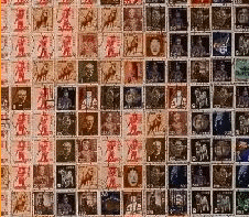 もう、おわかりだと思うが、これは切手によるコラージュである。このモナリザの顔(特に目)の辺りの部分の拡大図を次に示してみる。