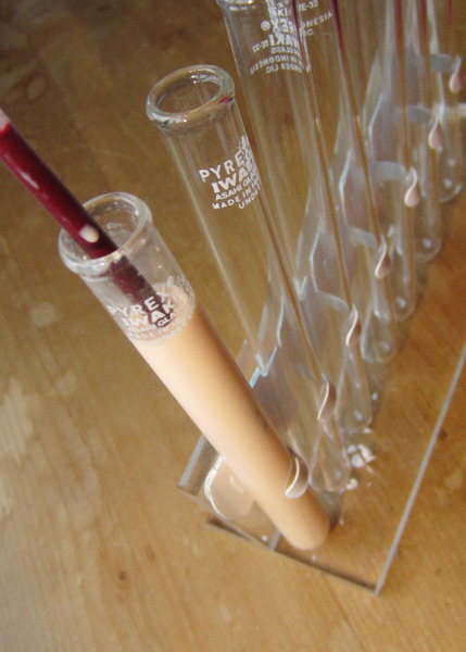 水に溶かした肌色絵の具を試験管に注ぎ入れ、その中に赤ボールペンの芯を入れてみます。赤ボールペンの芯は「脱酸素化ヘモグロビン*により暗赤色に見える静脈」を模しています。肌色の腕ならぬ肌色の(おそらく材料的にはミー散乱・レイリー散乱で模せる程度の)光拡散体に、暗赤色の静脈ならぬボールペンの芯を入れてみます。