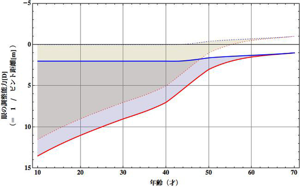 「眼の(ピントの)調整範囲」は、オフセットはありますが、年齢が同じであればたいてい同じくらいであって、「年をとるにしたがい、眼の(ピントを合わせることができる)調整範囲が狭くなる」ことが「老眼」です。だから、「老眼」は遠視の人にも近視の人にもモレなくやってきます。