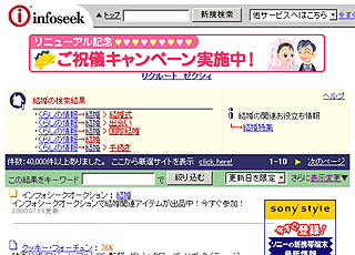 さて、話を検索キーワードに関するバナー広告に話を戻そう。試しにinfoseekで「結婚」で検索をかけるとこんな結婚情報サイトの広告が表示される。ありがたくて、涙が出そうになるくらいである。