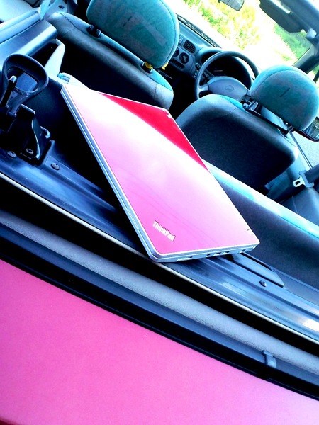 さて、今日は車にThinkPad Edge 13“を載せ、モバイル機として使ってみました。車がワインレッド色のカブリオレなので、グロッシー・レッドに彩られたノートPCは、車の中に放り込んでみると、互いのレッドの色合いが似合い過ぎて、まるでCM写真のような具合になってしまいました。