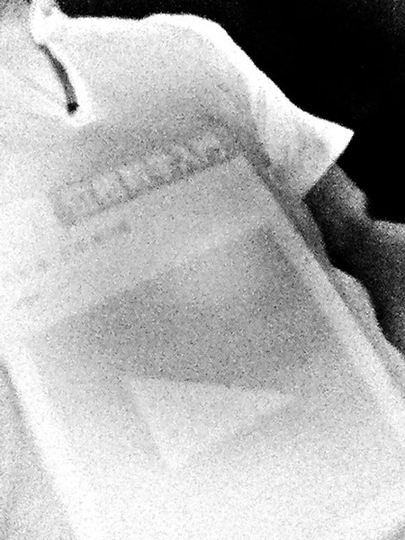 まずは、iPhone4のフロントカメラに可視光カット・赤外線通過フィルタ(IRフィルタ)を貼り付けます。IRフィルタが(可視光に対しては不透明なので)真っ黒のこともあり、黒いiPhoneの前面に貼り付けると、右の写真のように、何の違和感もなく(まるで何の加工もされていないかのように)自然な具合になります。・・・そして、フロントカメラでは「赤外線だけを撮影することができる」ような状態になったところで、黒いシャツの中に「本」を持ち(左手で支え)、iPhone 4 赤外線写真を(右手で)撮影してみました。