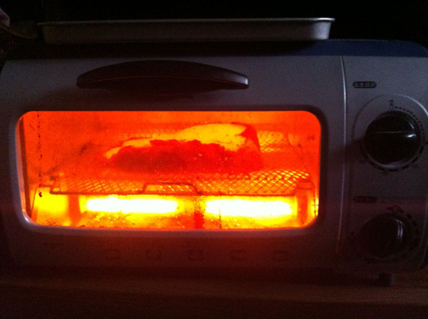まずは、キッチンに行き、赤外線を発していそうなものを(赤外線のキモチになって)物色し、何より赤外線を出しまくりそうな「(パンを焼く)トースター」を赤外線撮影してみました。それが下の写真です。左側が「可視光で眺めたトースター」で、右が「赤外線で眺めたトースター」です。赤外線で眺めると、うす暗いキッチンの中でパンを焼くトースターだけが光り輝いています