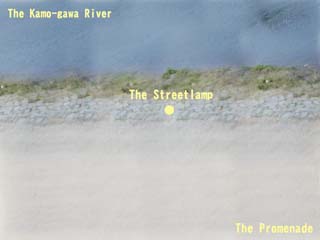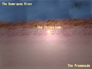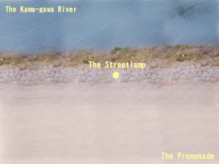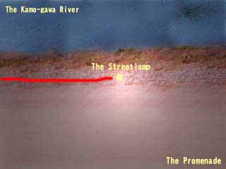![]() | 鴨川の川縁を真上から見た所。画面上部が鴨川。画面下部が歩道。画面中央に街灯がある。そのため、画面中央が一番明るい。 |