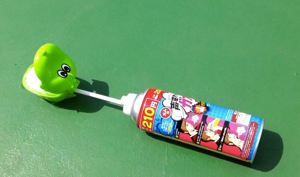 「空に浮かぶ立体物」を作り出す44万円の3Dプリンタが面白かったので、空を浮揚する立体物を作り出す3Dプリンタを自分でも作ってみることにしました。そこで、100円ショップのダイソーへ行き、シャボン液と(声変え用だから酸素も入っているけれど…)ヘリウムガスと、泡発生のフィルタ玩具を買って、空へ泡を飛ばしてみたのが、下に貼り付けた動画です。ヘリウムが注入された泡が恐竜くんの口からブクブク出て、そして白い泡は空の彼方へと飛んでいきます。