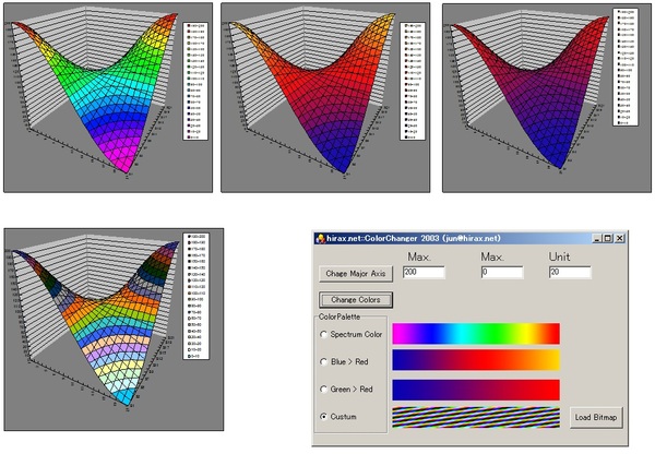 このアプリケーションを使うと、開かれているエクセルの中のチャート(複数のチャートがあれば、一番最初に作成したもの)を、等高面グラフや濃度グラフを、スペクトルカラー風にしてみたり、炎風の色表現にしてみたり、青→赤の色表現にしてみたり、と色々なことができます。…あるいは、Bitmapファイルを適当に作ってやれば、左端がグラフ中の下端の色として扱われ、一番右端の色が上端の色として使われたグラフに変えることができます。つまり、自由自在にチャートの色を簡単にカスタマイズすることができます。しかも、縦軸の最大・最小・分割幅なども設定することができるようになっています。