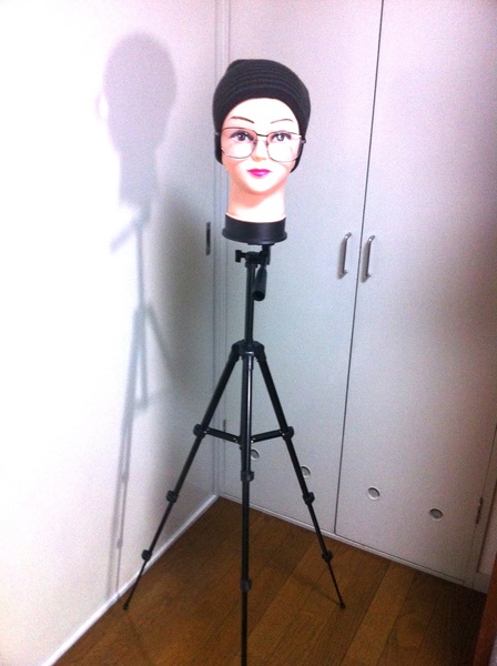 そして、Amazonで891円ナリの4段三脚を買い、メガネ・帽子台の下に取り付ければ、右の写真のような「超クールなメガネ・帽子スタンド」ができあがります。