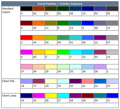 Excel's color palette contains 56 colors, all of which can be accessed and most of which can be replaced using ExcelWriter (v6 or later, .NET or Java). This article will describe the layout of the palette and enumerate the default palette colors.