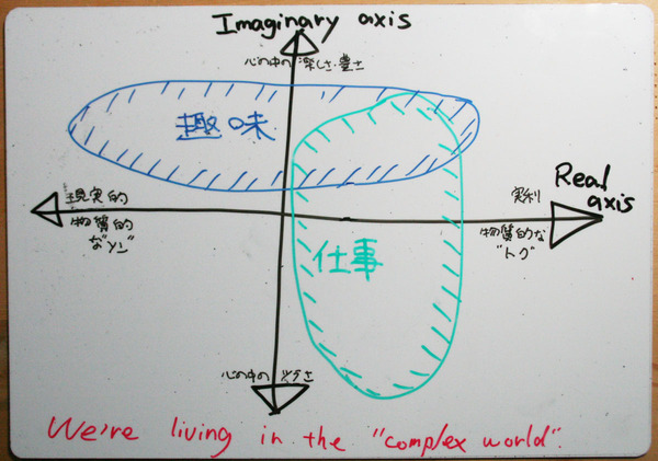 もしも、上に描いた複素平面="Complex plane"、それを言い換えれば言葉通りの「複雑極まりない世界」の上に、今のあなたが抱えているだろう「仕事」と、あなたが楽しんでいるかもしれない「趣味」は、どんなXY座標上にプロットされるだろうか。"複雑極まりない"複素平面上に、あなたはどんな軌跡を描いているだろうか。